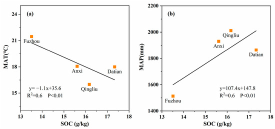 In this study, we used the mean annual temperature (MAT) and mean annual precipitation (MAP) in the past 20 years (from 2001 to 2020) to investigate the effect of meteorology on SOC. We explore the correlation between SOC and MAT (Figure 4a) and MAP (Figure 4b) in the four sampling regions. We found a significant negative correlation between SOC and MAT and a significant positive correlation between SOC and MAP. In Fuzhou, the MAT was the highest (21.5 °C), the MAP (1513 mm) was the lowest, and the SOC (13.5 g/kg) was the smallest compared to the other three sampling regions. The MAT and MAP in Anxi and Datian Counties were relatively close, and SOC in Datian County was larger than in Anxi. In Qingliu County, the MAT was the lowest (16.0 °C), the MAP was the highest (2012 mm), and the SOC was larger than in Fuzhou City and Anxi County. These results indicated that sufficient precipitation is beneficial and warming is harmful to SOC accumulation.