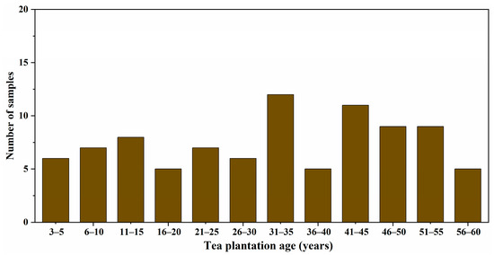 In the sampling, we selected tea plantations of different ages, ranging from 3 to 60 years. We divided them into 12 groups by 5-year intervals. There were 5 to 12 samples in each age group (Figure 5).