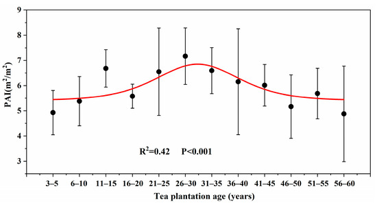 The tea plantations had different PAIs at different ages (Figure 6). The PAI was small in the age range of 3–5; the average value was 4.9 ± 0.9 m2/m2. In the young and mature tea plantations, the PAI increased with stand age and peaked at the age of 26–30, with an average PAI of 7.2 ± 1.1 m2/m2. After age 30, the PAI decreased with age and reduced to 4.9 ± 1.9 m2/m2 at the age of 56–60.