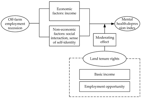 Based on the literature review and analysis above, a theoretical framework for the off-farm employment recession, land, and farmers’ mental health can be presented (Figure 1).