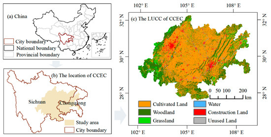 Overview of the study area. (a) the location of Sichuan and Chongqing in China; (b) the location of CCEC in Sichuan and Chongqing; (c) the LUCC of CCEC. Note: Map of China—Approval No. GS(2019)1822.