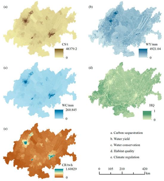 Spatial distribution of ES supply in the CCEC. (a–e) represent the spatial distribution of CS, WY, WC, HQ, and CR on the supply side, respectively.
