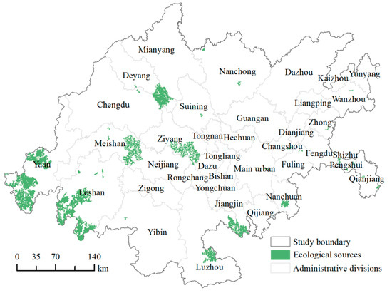 According to the assessment results of the ESDR, this paper extracted 72 basic ESAs and finally retained 35 after removing and integrating some broken patches, covering approximately 7914 km2, occupying 4.3% of the CCEC area. According to Figure 5, ESAs were mostly located in the southwest and southeast of the forest land, belonging to the Minshan–Qionglai–Liangshan ecological barrier region in the “four screens” of the territorial spatial planning in the CCEC. In addition, the central cities of Deyang, Meishan, and Ziyang also had some large ESAs. Sichuan Province issued the Work Plan for Controlling Greenhouse Gas Emissions in Sichuan Province in 2017. In the implementation effectiveness test by 2020, Deyang City has continuously deepened renewable energy and carried out large-scale use of new energy; the carbon emissions of Meishan City have declined for four consecutive years, and the carbon emission intensity of Ya’an City has remained low, making them the main ecological source of CS service.