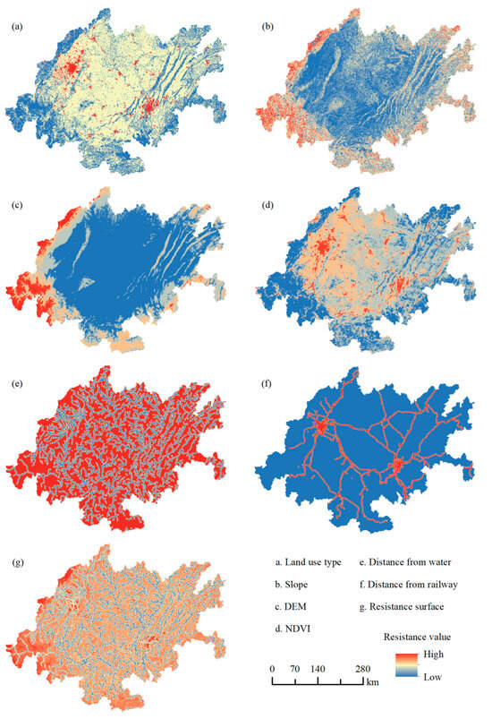 Single resistance factor and comprehensive ERS. (a–f) represent the spatial distribution of single resistance factor of Land use type, Slope, DEM, NDVI, Distance from water, and Distance from railway, respectively. (g) represent the spatial distribution of the comprehensive resistance surface.