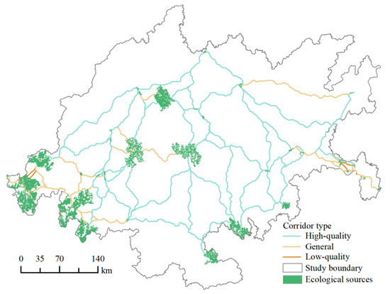 According to the principle of the MCR model, this paper extracted 91 ECs with a combined length of 10,701 km. There were 55 high-quality corridors, 31 general corridors, and five low-quality corridors. From Figure 7, it is evident that the longer ECs mostly appeared in the eastern region with fewer ecological sources. The longest corridor appeared at the junction of the ecological barrier belt of Dalou Mountain and Wuling Mountain in the eastern part of the CCEC, with a length of 321.2 km, while the shortest corridor was only about 10.4 km. Combined with the water systems map of the CCEC, we found that the extracted ECs were mostly river corridors; this reflects the key role of rivers in connecting ESAs, that is, assisting the migration of species and facilitating the transmission of energy.
