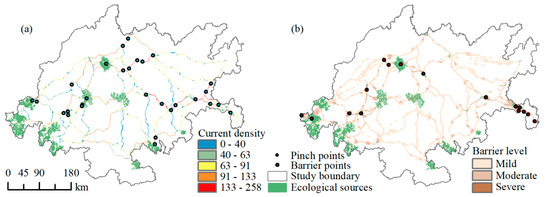 Extraction of EBPs: The areas where organisms encounter obstacles in the migration of ESAs are the EBPs. Eliminating these points will improve the circulation between different ESAs. The Barrier Mapper module can be used to extract EBPs in ECs. The module identifies areas where landscape connectivity is greatly affected by calculating how much current is restored after removing the barrier point. The size of the obstacle to landscape connectivity in a certain area is reflected by the cumulative recovery current value. Therefore, EBPs are the key focus areas when implementing the ecological restoration project.
