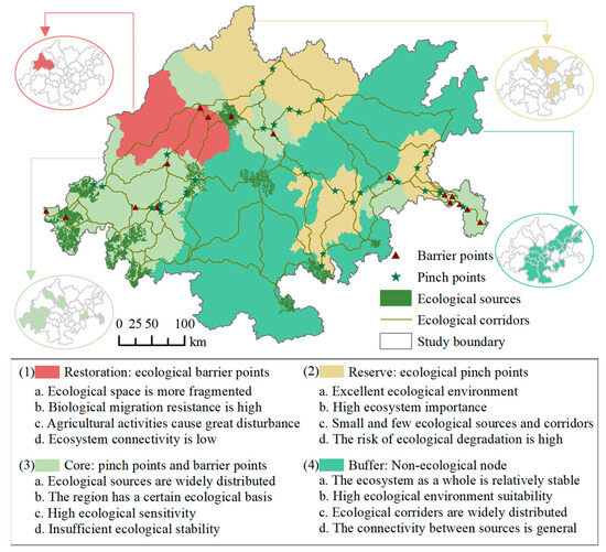 The ESP of the CCEC constructed by the above steps is shown in Figure 9. Delineating security zoning based on the existing ESP network can not only effectively maximize ecological benefits but is also a crucial measure to promote the completeness of the natural ecosystem. EPPs and EBPs are the key nodes affecting the circulation of ECs. Protecting the EPPs and restoring the EBPs are the most important links to implementing the optimization of ESP. As mentioned above, according to the properties and distribution characteristics of different ecological nodes identified by the CT, the ecological security zoning and the basic characteristics of each region are shown in Figure 9.