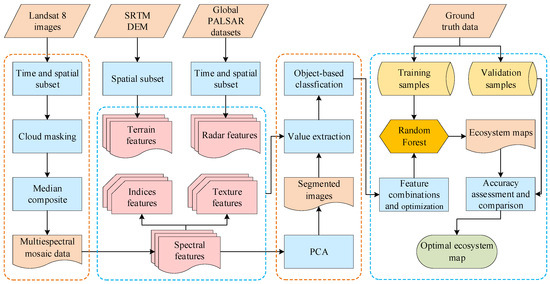 A total of 24 classified features, including Landsat 8 spectral bands, spectral indices, terrain features, radar features, and texture features, were selected to construct the feature dataset for mapping ecosystems in the study area (Table 2). All features were obtained and calculated in the GEE.