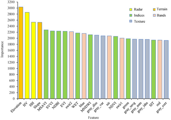 To achieve optimal classification accuracy, feature selection was conducted from two perspectives: combining classification features and optimizing feature selection. Initially, five feature combinations were established by integrating spectral bands, spectral indices, terrain features, radar features, and texture features (Table 4). The accuracy of these different feature categories was then evaluated. Subsequently, within the optimal feature combination, the classification features were ranked based on their relative importance. Features were incrementally added to the classification model based on their importance ranking, and the effect of incorporating an increasing number of features on classification accuracy was evaluated, thereby optimizing the set of features included in the final classification model [34].