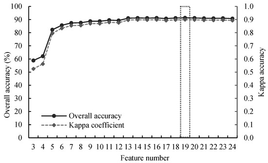 To further improve classification accuracy, we explored the changes in accuracy by incrementally adding features according to their importance ranking, with the results shown in Figure 5. A rapid improvement in classification accuracy was observed as the number of features increased from 3 to 5, mainly due to the high importance scores of the initially added features. As more features were progressively included, the classification accuracy exhibited a fluctuating upward trend. When the number of features reached 13, OA and KC for the study area reached 91.07% and 0.90, respectively, indicating a relatively high accuracy in delineating ecosystems. As the number of features continued to increase beyond 13, OA and KC showed a very gradual fluctuating increase, reaching their highest values of 91.34% and 0.90, respectively, when 19 features were included. Subsequently, the classification accuracy decreased as more features were added, with OA registering 90.89% and KC at 0.89 when the feature reached its maximum of 24. This decrease in accuracy can be attributed to the increased model complexity and overfitting caused by the addition of redundant features [72]. Therefore, we selected the top 19 ranked features based on their importance scores for mapping ecosystems in the dryland region, as this configuration achieved the highest accuracy while avoiding potential overfitting issues.