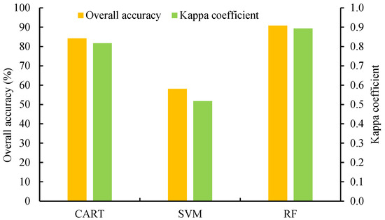 In this study, we employed an RF algorithm to map dryland ecosystems of an ecologically critical area in northern China. Prior to this, we compared the suitability of three commonly used algorithms—RF, CART, and SVM—to determine the most appropriate classification algorithm.