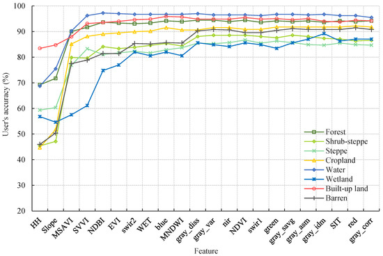 When all classification features were incorporated, UA attained its highest levels for all ecosystems (except cropland), reaching 94.18% for forest, 86.60% for shrub-steppe, 84.71% for steppe, 95.50% for water, 87.05% for wetland, 94.21% for built-up land, and 90.08% for barren.