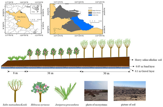 Coastal ecosystems are unique due to their position in the land–sea transition zone. The area of saline soils in the coastal zone increases continuously. The northern plain of Jiangsu Province falls along the 852 km coastline of the Yellow Sea and has saline–alkali soils covering an area of 6.53 × 105 ha, accounting for 25% of the saline land area in China [1]. The great agricultural potential of the area can be attributed to its rich light and heat resources. However, the excessive accumulation of salts and high exchangeable sodium content have resulted in the deterioration of the structure and hydraulic properties of this area, and the poor ventilation and water permeability of the soil in this area has increased its vulnerability to crusting and to the imbalance in nutrients that are available to plants [2,3,4]. Consequently, the region only supports salt-tolerant plants.
