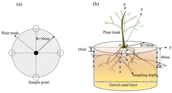 Four sampling points were set up at a distance of 30 cm from the plant trunk, and the lines of each adjacent sampling point to point (O) were perpendicular to each other, with the location of the trunk as the center point (O) (Figure 2a). Root cores were taken from four soil depths (0 to 10 cm, 10 to 20 cm, 20 to 30 cm, 30 to 40 cm) by using a 10 cm diameter root auger (Figure 2b), and then, the mixed root cores from 4 sample points were placed at the same depth, and 240 root cores were collected. The rhizome samples were rinsed to remove excess soil, followed by a washed sample placed in a ventilated area for drying. After no water droplets were observed on the surfaces, they were used for laboratory determination of rhizome parameters. The rhizome image analysis system Win RHIZO was used to scan and analyze the root parameters of each root sample (including the diameter of a root and root length, surface area, volume, and length density). After scanning, the roots were over-dried at 75 °C to a constant weight, and a tray balance measured the dry weight.