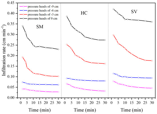As illustrated in Figure 3, the initial infiltration rate rapidly decreased, followed by stabilization after 15 min. The present study further calculated the IIR and STR for an improved assessment of the capacity for infiltration under different high-pressure heads and types of vegetation, as illustrated in Figure 4. There were significant differences in the rates of infiltration among different types of vegetation (p < 0.05). The ranking of the decrease in IIR and STR was 0, −3, −6, and −9 cm. The IIR and STR of SV were higher in higher heads of pressure of 0 cm than in higher heads of pressure of −9 cm by 710 and 721% (p < 0.01), respectively. The IIR and STR in SV exceeded those in SM and HC. In comparison with those in SV for high-pressure heads of 0 cm, IIR and STR increased by 23.37% (p < 0.01) and 56.52% (p < 0.01) (p < 0.01) in SM and by 8.81% (p < 0.01) and 31.87% (p < 0.01) in HC, respectively.