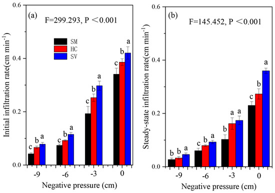 All vegetation significantly enhanced the soil-saturated hydraulic conductivity in comparison with initial values. In addition, the initial and steady infiltration rate under different negative pressures varied consistently among the three treatments (Figure 2 and Figure 3). Because of the large gradient of the soil’s matrix potential, the soil’s rate of infiltration remained high during the initial infiltration stage. With the progression of infiltration, the soil’s matrix potential gradient continuously decreased, and the influence on infiltration by the gravity potential gradually increased. The soil’s rate of infiltration showed a significant downward trend and gradually stabilized. At this point, the soil’s matrix potential gradient approached zero, and the soil’s rate of infiltration could be regarded as a stable rate of infiltration of the soil [44]. The initial infiltration rate typically has the highest impact on the leaching stage during initial irrigation stages, and the steady rate of infiltration indicates soil infiltration and soil infiltrability at later states of irrigation [45].
