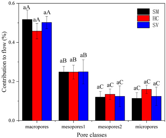 Changes in the contribution of each class of pore to flow under three vegetation types. The same lowercase letters in the same pore class indicate a significant difference at p < 0.05. Different capital letters in the same column under the same vegetation restoration type indicate a significant difference at p < 0.05.