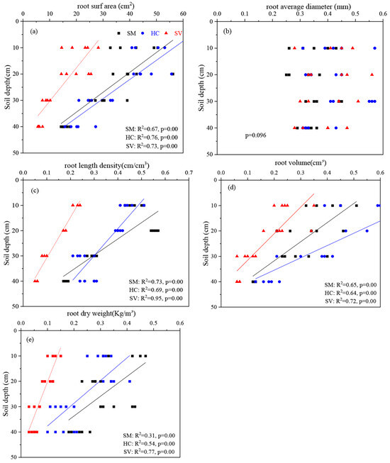 Changes in roots’ morphological properties (root surface area, root mean diameter, density of root length, root volume, and root dry weight) of different vegetation types at different depths of soil are illustrated in Figure 6. The results demonstrated that the root surface area, density of root length, volume of roots, and dry weight of roots showed inverse relationships with the soil depth for all treatments (except for the root average diameter, which was higher at a 20–30 cm soil depth than at 0–20 cm and 30–40 cm). The average root volume and average root dry weight at a depth of soil of 0–20 cm accounted for 68.26% of the total root volume and 61.02% of the total root dry weight, respectively. The outcomes of the one-way ANOVA demonstrated that the vegetation types of HC treatments had higher values of root mean diameter, root surface area, and root volume than the vegetation types of SM and SV treatments at each soil depth interval. The density of the root length for SM exceeded those of the other two types of vegetation (p < 0.05) (Table 4).
