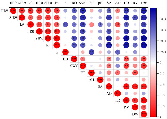Pearson correlations for infiltration rates, soil physical properties, and plant root characteristics. IIR0 and IIR9, initial infiltration rate at pressure heads of 0 cm and 9 cm, respectively; SIR0 and IIR9, steady infiltration rate at pressure heads of 0 cm and 9 cm, respectively; Ks, saturated hydraulic conductivity; K9, hydraulic conductivity at pressure heads of 9 cm; BD, soil bulk density matter; SWC, soil moisture content; EC, soil electric conductivity; SA, root surface area; AD, root average diameter; LD, root length density; RV, root volume; DW, root dry weight. Indicated values represent the correlation coefficients. The blue color indicates a positive correlation, and the red color indicates a negative correlation at significant levels of * p < 0.05, ** p < 0.01, and *** p < 0.001.