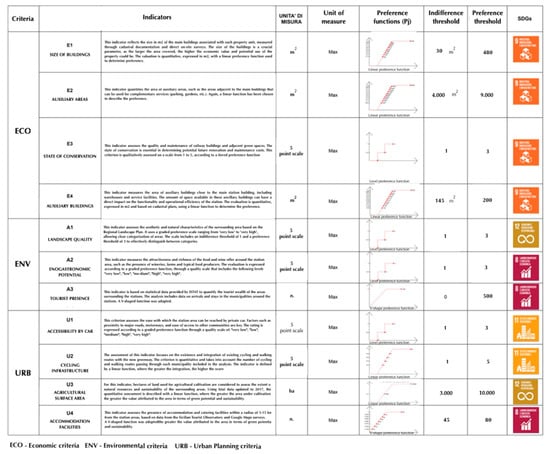 The selected criteria address relevant aspects of the decision problem according to the Sustainable Development Goals (SDGs) [], i.e., environmental, urban, and economic qualities, and provide a sound basis for the evaluation of alternatives. These criteria were then further explored to arrive at a set of measurable indicators to assess the impact of the alternatives under consideration. Finally, a preference function was assigned to each indicator, including relative indifference (q) and preference (p) thresholds, to help decision-makers determine the point at which one alternative becomes preferable to the others (Figure 1).