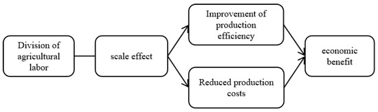 Marshall elaborated the formation path of economies of scale in Principles of Economics. Internal economies of scale involve the optimal use of resources within enterprise to achieve economic efficiency; external economies of scale, on the other hand, rely on the division of labor between enterprises and the optimization of geographical layout. These two paths together constitute the main formation mechanism of the scale economy and have explanatory power for a wide range of economic phenomena. In the field of agriculture, this theory is also applicable. Rural land transfer promotes the formation of internal and external economies of scale by optimizing resource allocation and enhancing production efficiency. There are two main ways in which the division of production among farmers affects economic efficiency (Figure 2).