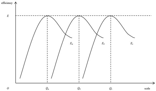 - The division of labor in agriculture improves economic efficiency. As shown in Figure 3, this study can divide the agricultural production process into several steps. Each step requires different scale conditions to maximize efficiency, so farmers can outsource certain steps or some of the tasks to others according to their agricultural business capacity to achieve the optimal level of economic efficiency through service scaling [39] (In Figure 3, the X-axis represents the scale of production or a service, which can be measured in terms of the quantity of output or the amount of resources invested, while the Y-axis, efficiency, reflects the maximum output for a given input or the minimum input for a given output and is usually measured in terms of indicators such as unit cost or productivity.).