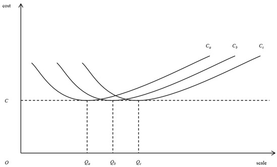 - The division of labor in agriculture saves on operating costs. As shown in Figure 4, the definition of economies of scale in agriculture suggests that there is a downward trend in average costs as the land area increases. However, the lowest possible average cost for each process cannot be achieved because of the differences in the production practices of farmers. Therefore, farmers can choose the division of labor to carry out certain aspects of production, to a certain extent, to achieve the scale of production, thus effectively reducing the cost of agricultural production and operation [39] (In Figure 4, the X-axis also represents the scale of production or a service, while costs on the Y-axis refer to the total expenditures required to produce a given quantity of a product or provide a given quality of a service, including the costs of raw materials, labor, the depreciation of equipment and so on. These costs are usually calculated based on the actual financial data of the company).