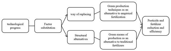 Farmers are the micro-subjects of pesticide and fertilizer reduction, but the inherent path dependence of production decisions means that the autonomous production processes of farmers generally lack the intrinsic motivation to lose weight [40]. The theory of technological progress suggests that technological progress can promote the effective substitution of factors, this usually refers to the fact that in a production process, due to a change in the price, quality or availability of a factor, a producer may choose to use other factors of production in place of the original factor in order to maintain or improve production efficiency. This substitution effect reflects the relative prices and substitutability of factors of production and is an important aspect of production decisions, thus allowing farmers to achieve pesticide and fertilizer reduction and efficiency [41], as shown in Figure 5:
