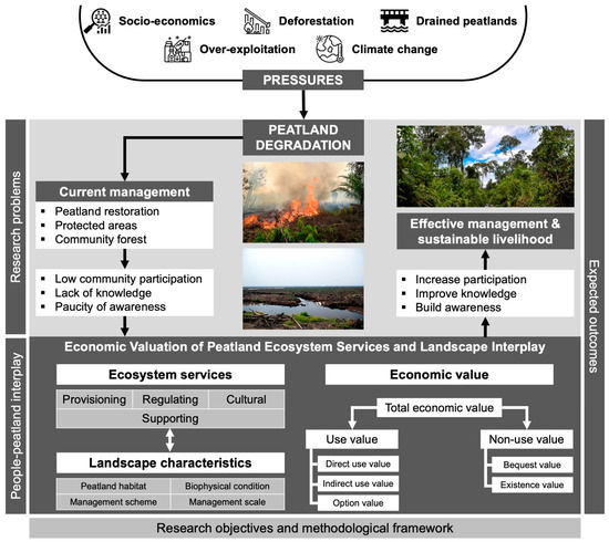 Limited engagement from local communities presents a significant barrier to effective peatland management. It likely stems from a low understanding of the intrinsic value of peatlands and the degree to which degradation impacts local livelihoods. Consequently, the need for peatland protection is often overlooked. Economic valuation can be a powerful tool to address this knowledge gap. Quantifying the benefits provides much-needed evidence to show how peatlands contribute to local livelihoods. Moreover, the amounts and quality of ESs are directly influenced by habitat types, ecosystem conditions, and management regimes. These characteristics interplay and form a unique landscape pattern that illustrates locality. Figure 3 depicts the scope of this study, including the research problems, objectives, methodological framework, and expected outcomes. Key peatland ESs were identified following the Millennium Ecosystem Assessment [37]. The TEV consists of the use and non-use values of the peatlands. The use value shows the benefits that people obtain from ecosystem goods and services, including (a) a direct use value representing consumptive and non-consumptive activities; (b) an indirect use value derived from ESs that support or protect economic activities rather than directly providing goods and services to people; and (c) an option value, illustrating a possible use of resources in the future both directly and indirectly. Non-use values also refer to benefits obtained without direct or indirect involvement with the resources, including (a) the bequest value, showing the value that people imagine for future protection of an ecosystem; and (b) the existence value, derived from the presence and importance of a particular ecosystem or species. This study measured the TEV of peatland ESs, capturing both use and non-use values. The estimated TEV allows stakeholders to compare ES value against other commodities and actions. Thus, it will improve public knowledge, awareness, and willingness to participate in active forms of peatland management.