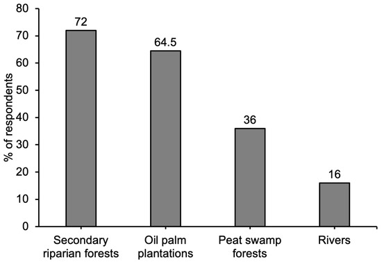 Residence locations, such as the village center, local market, rivers, protected area, oil palm plantations, and secondary riparian zones, were classified into distance and proximity classes. Sixteen percent of the respondents came from the Buluh Cina Village—a settlement inside the protected area prior its establishment. Their households were within a 2 km proximity of the peat swamp forests where the villagers harvest products. The distances from other villages to the peatland locations varied considerably (Table 4).