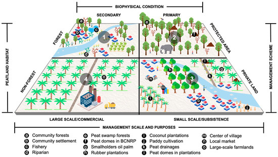 Multifaceted landscapes reflect a combination of landforms and topography, land cover and habitat biophysical conditions, land use patterns, and management institutions. Along with dynamic livelihoods, these elements complicate peatland management [31]. Villagers do not perceive ESs in the same way due to different interactions with the local environment. Strict enforcement of rules and regulations in protected areas controls villager access to resources, thus diminishing their benefits and eventually weakening connections between people and nature [32]. Meanwhile, easy access to community forests and oil palm plantations illustrates a strong connection between people–peatland goods and services. Villager perceptions rooted in personal experiences with nature influence their behavior, doing something or doing nothing. Therefore, effective management requires activities that are compatible with local biophysical and socioeconomic contexts [33,34,35,36].
