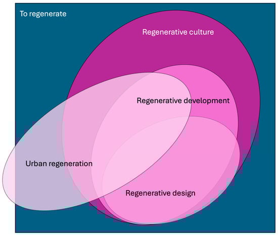 In summary, the different definitions of regeneration overlap (Figure 1). Regenerative culture aims to embrace both regenerative design and development, and it includes parts of the urban regeneration principles, as these are not always entirely focused on the regeneration of environmental resources [52]. The overlap between regenerative development and design is also partial because development includes a broader spectrum than that served by the (spatial) design disciplines (such as psychology or the deep connection to place) [55]. Urban regeneration overlaps with all three other forms of regeneration but can also have adverse effects in the form of using more resources than can be regenerated, and therefore, it is partly placed outside the ‘to regenerate’ box. This article focuses on creating a regional regenerative framework and starts from the spatial perspective (design) to subsequently embrace regenerative development and culture from there.