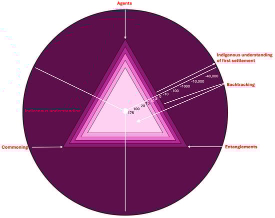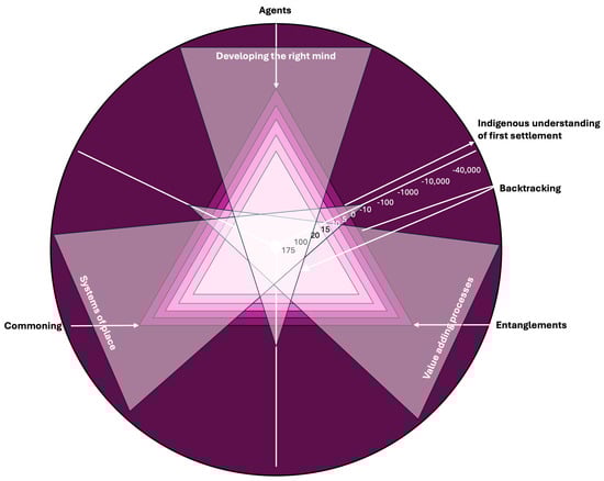 Commoning, entanglements, and agents formed the three cornerstones of the framework. Because civic transformations have determined the way of living together for a long time, and will do so in the far future, the depth of the model showed the connection to country as embraced in nearly all traditional and indigenous cultures [71,72], up to 40,000 years back. This was the reason for integrating the timeline in the framework, so that an ongoing civic transformation could emerge from the past to the design for seven future generations [73,74], for more than 175 years (Figure 3).