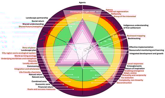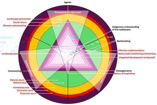 The four returns framework [42] was the third addition. It involves the shared understanding and establishment of a landscape partnership, developing a landscape plan, implementation, and monitoring. These aspects were located in the framework close to the agents, entanglements, or commoning (Figure 5). Moreover, the type of return (inspiration, social, natural, or financial) was similarly placed in the framework. As layers beneath the civic framework, the zones of intensity were integrated: the lowest intensity in the biggest natural zone, the intermediate intensity in the combined zone, and the largest intensity (and smallest size) in the economic zone. Finally, this framework was aligned strongly with the long timelines of the relationship to country by defining landscape returns to periods of at least 20 years.