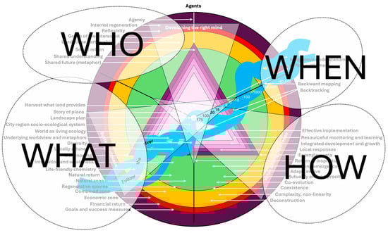 The key concepts were allocated according to their intrinsic role in the process of regeneration (see Table 1 and Figure 8). Some of the concepts discuss the understanding of time and the past (WHEN), others focus explicitly on the content (WHAT), the way to achieve regeneration (HOW), or the responsible people, institutions, or groups (WHO). Now that the characteristics were placed in the framework, the coherence became clear. Central in this was the symbol of the river, which could be followed to establish the most regenerative outcomes for the region. If we follow the river, the long history of the place is connected with a future vision of the long-term landscape plan, which is driven by reciprocity and mutuality and sees the world as a living system. In this shared future of commoning, the city and region form one socio-ecological system, where regenerative, life-friendly places provide the return of inspiration. Co-evolution and emergence are key processes to provide continuous adaptation to change. A shared understanding and relationship to the land guides local responses and harvesting what the land provides.
