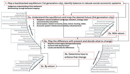 The methodology for integrating the theoretical regenerative framework and the urban regions findings was based on the relationship between process and design. The underlying assumptions were that humans are seen as part of nature, an open mind is deployed so the world can be seen in new ways, the designer is given a new role in which eco-socio-cultural and psychological literacy plays a major role, and in the process, the goal is to improve the value of the whole system by working developmentally [67]. The new regenerative framework for regional planning deployed these values by simultaneously creating the environment (the design) in which people and living systems can then create their new potential (the process). Or in reverse order: to identify the process of creating new potentials by crafting a design that enhances this. The genius loci, or the specific place, was placed central to create a local narrative by understanding the complex, adaptive, and dynamic patterns as parts of a bigger picture [49]. In this way, it bridged the biophysical and social-ecological systems [68].