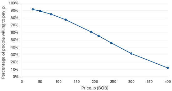 To illustrate the effects of prices on the respondents’ preferences, a demand curve for the environmental passport was derived using data collected on the WTP of the population in relation to the passport price based on Equation (4). As depicted in