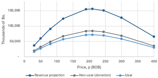 Furthermore, we constructed a revenue curve accounting for both users and non-users. Classification into these groups was determined based on the participants’ responses to the question: “Do you plan to visit a National PA during 2023?” The respondents who indicated they did not intend to visit such areas were categorized as non-users, and their passport purchases were considered donations. Conversely, those answering affirmatively were categorized as users. As illustrated in