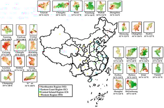 This study analyzes and evaluates the urban spatial coupling development level of 30 national and provincial capitals across China. To facilitate our analysis, we divided these cities into four geographical regions: east, northeast, central, and west (Figure 1). As key drivers of smart city development in their respective regions, these cities represent ideal representatives for our research.