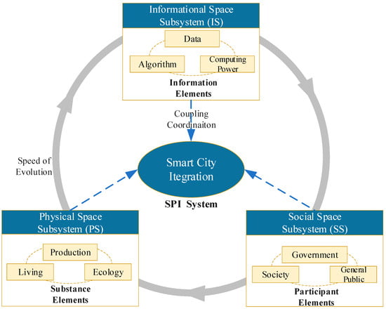 To address concerns surrounding information development in smart cities and explain its spatiotemporal structure, this study proposes an integrated, tri-dimensional evaluation model. This model (Figure 2) is developed according to a comprehensive literature review and qualitative analysis. Smart cities, as complex and expansive systems, are the product of the coupled coordination of three subsystems: physical space, social space, and information space. The informational space, a virtual network, comprises data, computing power, and algorithms. In contrast, physical space comprises the tangible elements of production, ecology, and daily life. Social space, on the other hand, arises from the interactions of various actors such as government, civil society, and the public, affecting shared attitudes, behaviors, and values. Crucially, these subsystems are not isolated; rather, there is close interaction between each subsystem, forming the “physical–social” subsystem, “information–physical” subsystem, and “physical–social” binary subsystem.