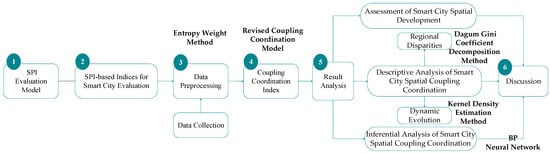 This paper employs a six-step method (Figure 3) to analyze smart city development. First, a tri-dimensional spatial evaluation model, termed the Smart City Potential Index (SPI), is established. Second, drawing upon the SPI model, a comprehensive index evaluation system is constructed across three key dimensions. Third, data are collected according to the index system, standardized utilizing the entropy weight method, and assigned corresponding weights. Fourth, a modified coupled coordination degree model is applied to the standardized data and indicator weights, generating a coupled coordination degree index. Fifth, based on the evaluation of the coupling coordination of the tri-dimensional space, an analysis of smart city development is undertaken, including regional difference analysis utilizing the Dagum Gini coefficient, dynamic evolution analysis through kernel density estimation, and predictive modeling utilizing a BP neural network. Finally, the study concludes by synthesizing key findings and offering policy recommendations.