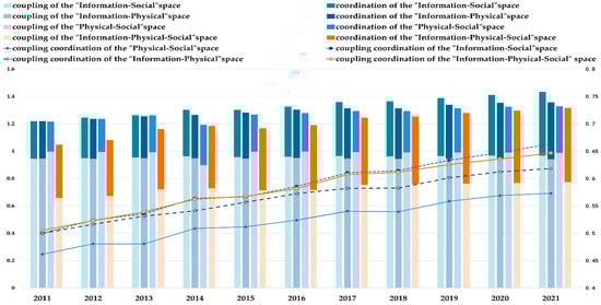 This study also analyzed the pairwise combinations of the tri-dimensional space to specifically calculate evaluation indices for each of the binary spatial subsystems. Overall, all four types of evaluation indices demonstrated a consistent upward trend from 2011 to 2021. Focusing on the scale of coupling coordination, the evaluation index for the “physical–social” space increased from 0.462 to 0.573, with the coupling coordination level rising from “nearing disarray decline” to “barely coordinated”. Similarly, the evaluation index for the “information–social” space climbed from 0.499 to 0.663, with its coupling coordination level progressing from “nearing disarray decline” to “basic coordination”. Likewise, the evaluation index for the “information–physical” space increased from 0.499 to 0.618, and its corresponding coupling coordination level also advanced from “nearing disarray decline” to “basic coordination”. The minimal differences observed between the evaluation indices of these three binary subsystems highlight a relatively balanced development pattern across the binary spatial relationships in China’s smart city development process. In addition, the evaluation index for the “information–physical–social” space demonstrated an increase from 0.505 to 0.646, with its coupling coordination level shifting from “barely coordinated” to “basic coordination”. Compared to the other three evaluation indices, this particular index exhibits some integration advantages, suggesting that the overall integration degree of the “information–physical–social” space in China’s smart city development is relatively superior. Specifically, after 2018, the development level of the “information–society” space started to surpass that of the overall SPI system, indicating that the coordinated development of this specific “information–society” binary subsystem is progressively offering strong support for the advancement of the broader SPI system.
