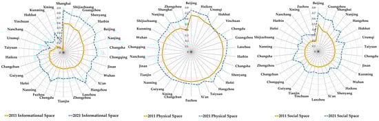 Specifically, the comprehensive index of the information space demonstrates a clear trend of “diffusion”. This indicates the significant effect of the rapid iteration and upgrade of information technology over the past decade, particularly in reshaping the information space. Simultaneously, a significant development gap is evident among smart cities, with polarization becoming more significant. In 2011, the top five cities were Shanghai (0.587), Shijiazhuang (0.586), Guangzhou (0.528), Guangzhou (0.525), and Harbin (0.465), whereas in 2021, the top five cities were Shanghai (0.854), Guangzhou (0.784), Harbin (0.771), Shijiazhuang (0.770), and Shenyang (0.763).