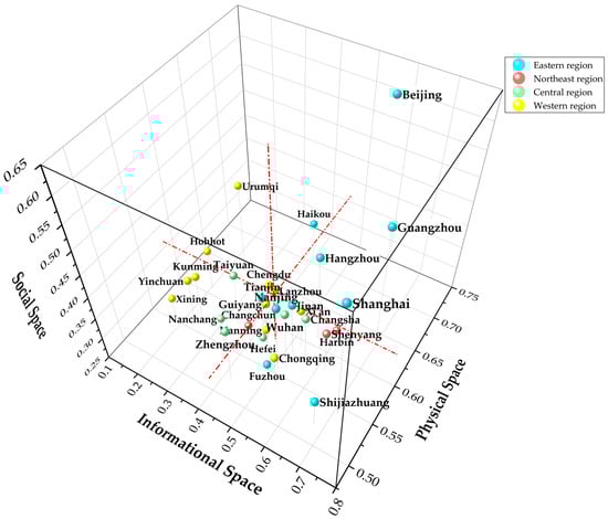 - , , and represent the comprehensive evaluation indices of the dimensions of information space, physical space, and social space, respectively.