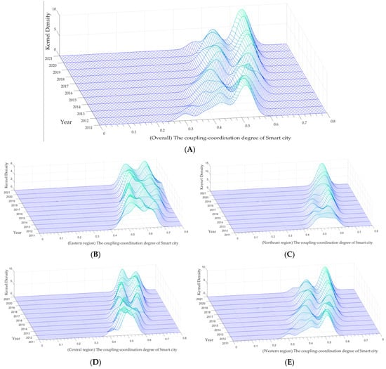As illustrated in Figure 7B, the eastern region exhibits a growing number of peaks, with peak heights reaching their apex in 2017 before entering a period of gradual decline. The narrowing of the curve’s opening width observed from 2011 to 2015, followed by annual expansion post-2015, coupled with a unique right tail, suggests a reducing regional difference in the spatial coupling coordination of smart cities in the East, signifying a transition towards a more multipolar configuration.