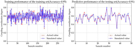 This study leveraged a BP neural network to analyze the contribution differences of 31 indicators in a smart city spatial system towards achieving coupling coordination, finally identifying key influencing factors. The BP neural network algorithm was implemented in Python utilizing statistical libraries. Thirty-one indicators, detailed in Table 1, Table 2 and Table 3, representing various facets of the smart city spatial system, were designated as input nodes, while coupling coordination represented the output node. Following normalization, a dataset comprising 330 samples was constructed, including data from 30 smart cities between 2011 and 2021. Of this dataset, 280 samples were allocated for training the neural network and the remaining 50 were reserved for testing. A series of simulations yielded satisfactory results, demonstrating a strong correlation between simulated and actual values. Both the training and testing sets exhibited excellent fitting, achieving accuracy rates of 95% and 91%, respectively (Figure 8). This high level of accuracy highlights the model’s feasibility. Then, weights assigned to connections between the input and hidden layers, as well as between the hidden and output layers, were extracted. These weights were then employed to calculate the contribution rates of each indicator to the overall coupling coordination in the smart city spatial system.