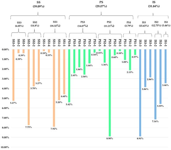 Figure 9 illustrates the contribution rates of information space (blue bars), physical space (green bars), and social space (orange bars) to coupling coordination, at 39.09%, 29.07%, and 31.84%, respectively. While the data initially suggest that physical space plays the most significant role in smart city coupling coordination, this study takes into account the significant differences in third-level indicators across different spatial systems. To offer a more accurate assessment, we utilize the average indicator contribution rate for each unidimensional subsystem. These rates, for information space, physical space, and social space, are 5.31%, 2.08%, and 3.55%, respectively. This optimized analysis indicates that information space actually holds the most significant role in coupling coordination, followed by social space, with physical space having the least effect. This finding aligns with the increasingly prominent role of information space in empowering smart cities, particularly in rapid advancements in digital technology. In addition, the increasing emphasis on diversified social governance further highlights the importance of effective coordination and collaboration among governing entities. This collaborative approach facilitates the integration and realization of diverse resource elements in smart cities; on the other hand, physical space, traditionally a focal point in smart city development models, has reached a relative level of maturity, hence its marginal benefits are relatively low.