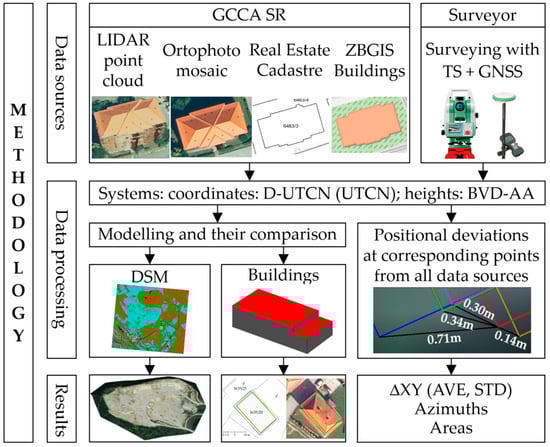 When using spatial data from different sources, the level of their mutual agreement is unclear. The accuracies of the spatial data from the provided sources are listed, but they sometimes do not correspond to the facts. The main goal and, at the same time, the novelty of this scientific study are the analysis of the compatibility of freely available spatial data based on positional data in terms of accuracy of deviations of corresponding points of the fixed foundation of the selected building and their applicability for further use in the CAD environment (Figure 3). A part of the solution also focuses on errors that may occur in the input data and their processing. LiDAR point cloud, orthophoto mosaic, and vector data from information systems in Slovakia (Real Estate Cadaster, ZBGIS Buildings–basic database for the geographic information system) were chosen as input data. The same coordinate system was used for all spatial data, including its implementation. It is important that, before importing data or connecting layers, the desired implementation of the coordinate system of the data or layer is selected, and then, the distances between the two corresponding points in the two layers is measured when viewed from above. Subsequently, the positional deviations of the corresponding points were determined and analyzed according to size and orientation. If the values of the deviations of the corresponding points are small, it can be concluded that they are compatible data sources. If they are large, they are incompatible and unsuitable for further joint processing. A systematic research approach cannot be easily applied to a larger number of buildings. When determining the corresponding points forming the fixed foundation of the building, the problem arises that many buildings have roof edges wider than the fixed foundation of the building. It is problematic when using buildings with a projecting roof (they are the predominant majority) because the corresponding roof in the orthophoto covers their solid foundation. It would only be estimates of the solid foundation of the orthophoto. Thus, the comprehensive approach is not fulfilled.