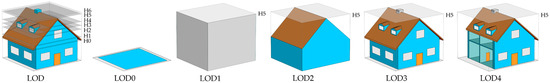 The methodology of 3D modeling of buildings from a point cloud of LiDAR data are presented in studies [43,44,45]. From the point of view of the complex processing of the 3D building model, it is necessary to consider up to five levels of detail (LOD), i.e., LOD0, LOD1, LOD2, LOD3, and LOD4 [46]. The height of the modeled building can be chosen in different height levels of building H0-H6 [47] (Figure 4).