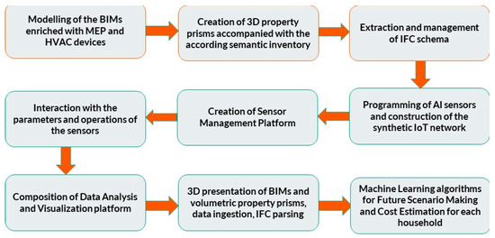 City-scaled DTs that are empowered by gamified operations have also been developed [34]. Schemas describing the ideal operation and structure of building Digital Twins have been developed, presenting a BIM model as the basis for visualization and making predictions. In addition, it can be a source of sensor data that are updated in real-time and a cloud-based inventory or database that can host the sensor-acquired information and simulative results for optimal building management [35]. Community-based DTs can also be structured with their focus being on individual elements such as the urban systems that compose an urban center i.e., transportation networks, traffic, etc. [35]. DT advancements could be supported and aided by the new rising trend in the technological department of AI that concerns multiple fields of interest such as scientific, environmental, economic, etc. AI can contribute to a plethora of sectors and has already left its impact on medical, engineering, and communication applications. AI can be merged with a wide abundance of technologies and is adjustable to many standards, providing economically responsible, quick, and smart solutions. A simulation of a city center has been made, after being properly equipped with IoT devices, for the optimal observation of all urban facilities through AI algorithms [36]. Sensors can provide vital data on humidity, temperature, etc., which can aid optimal energy expenditure [37]. IoT networks can empower optimal energy consumption and modernize the current state of things [38]. Programs that merge BIM and IoT for monitoring the thermoregulatory behaviorism of household owners have been developed [39].